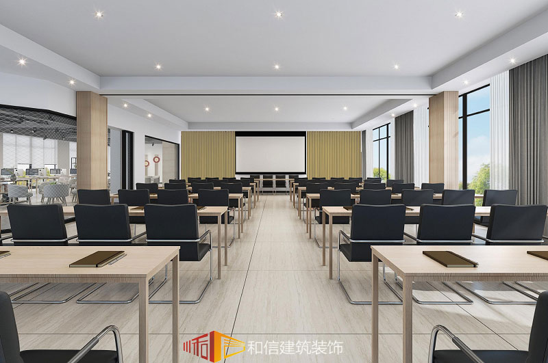 會議廳作為智慧的充電站,是集學習、黨建活動于一體的智能空間,桌椅整齊有序地擺放,營造出濃厚的學習氛圍,結合燈光的控制,線與面交織延伸,時尚又不失莊嚴。