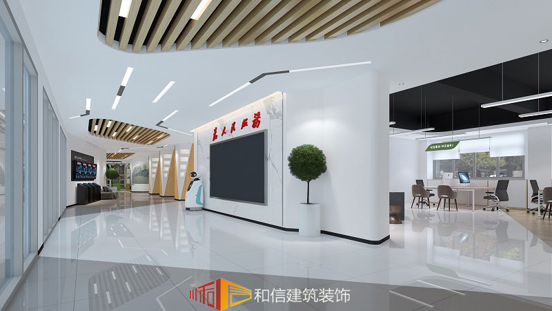 辦事大廳黑白空間碰撞,大面積窗戶將外面的自然景觀引入,給人以清新的感覺,簡潔、醒目,休閑區巧妙地將空間分為兩個功能區,流線展示合理引導觀眾路線,讓人感受空間變化的魅力。
