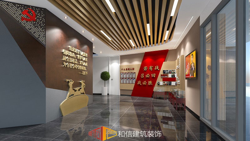 走進黨群宣傳過道,引入眼簾的是兩側墻面的宣傳牌,展示的內容是歷經歷史文化底蘊,黃、棕、紅的經典搭配,原木與大理石碰撞,配以燈光氛圍,營造出濃厚的文化歷史底蘊,同時也豐富了空間的層次感。