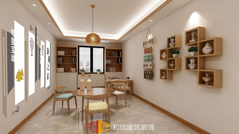 接待區整個空間為原木色調,令人向往的溫暖空間,色彩和紋理和諧交融,簡致純粹的自然底色,舒適溫馨而不失格調,置身其中,觸摸著原木質感的家具,嗅著原木質樸的芳香,看著滿眼溫暖的木色,人們在這里看書、休憩、鄰里喝茶,彰顯出一種返璞歸真的氣息。