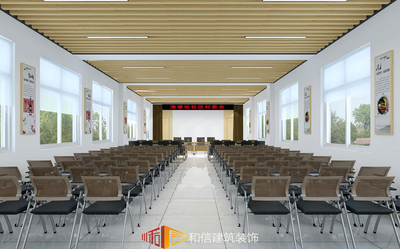 會議室椅子整齊地排列,給人一種穩重大氣的感覺,兩邊墻面窗戶設計,看似簡單,卻將室外的光線和景觀引入室內,在會議或者活動的同時還有美景相伴,減少了壓抑感。