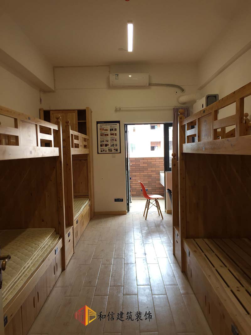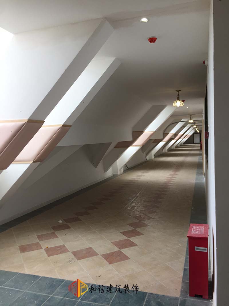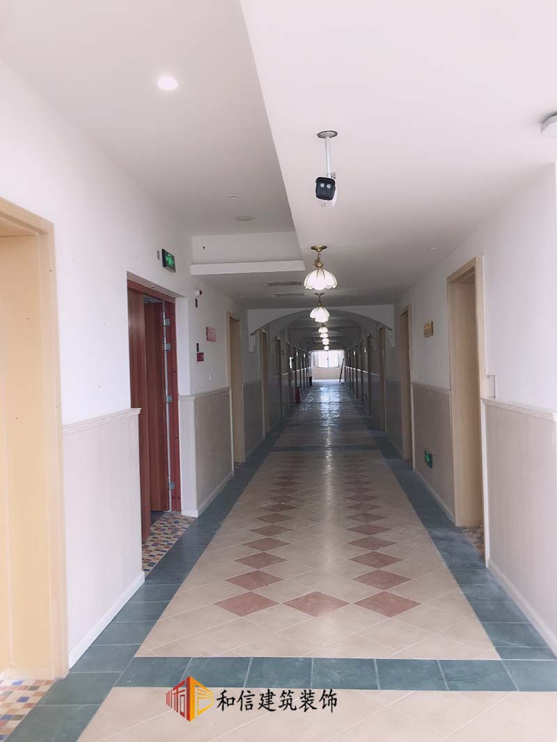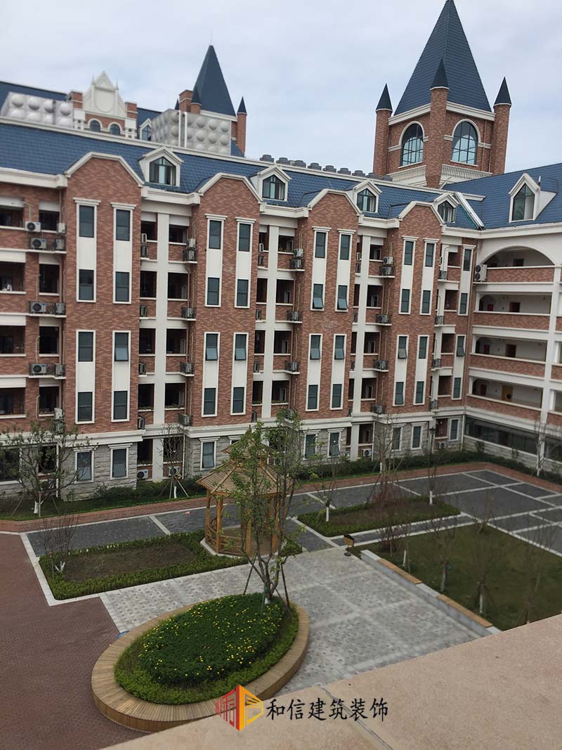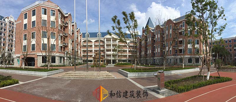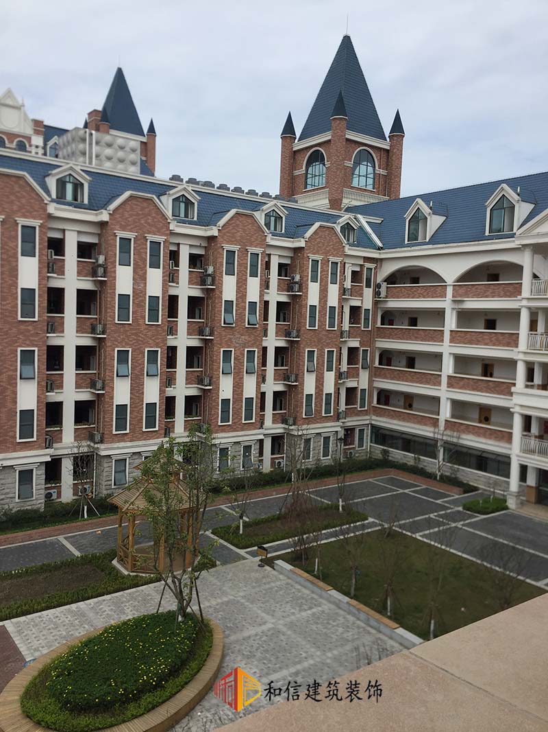 學校裝修外觀為古典城堡建筑風格,錯落有致,色調搭配和諧、穩重的同時冷暖色系比例合適,給人一種積極向上的觀感。室內延續了建筑的色彩搭配,古典精致的吊燈安排在學生宿舍走廊,希望帶給學生一種溫暖的歸屬感。
