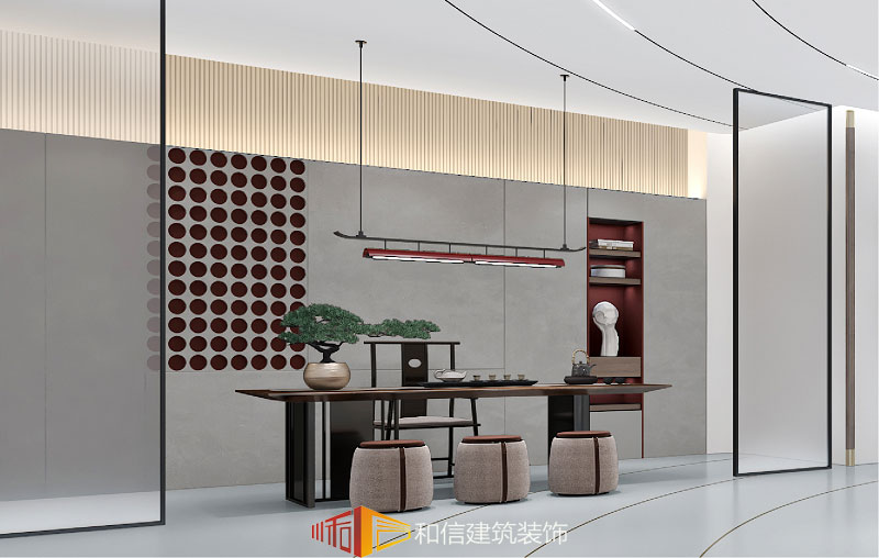會客茶室簡潔淡雅的基調,中式風格意境,無論是木質的色彩還是中式流暢的線條,都給人一種寧靜致遠的感覺,從傳統茶文化出發,烘托茶韻。
