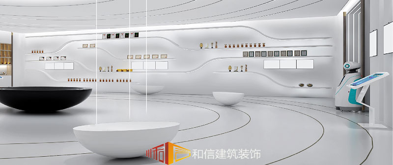 整體基調多采用圓、弧造型來營造家居展廳的溫潤柔和和流動性,整體墻面采用白色乳膠漆材質來表現場景的體積感,頂部的圓與空間造型的圓相呼應,整個展廳簡潔大氣。